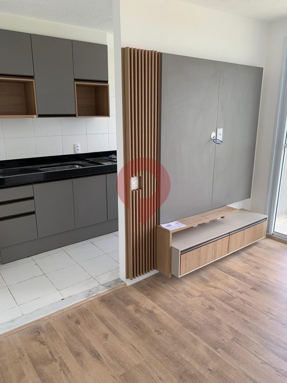 A sala é espaçosa, conta com um painel de TV e se integra a uma agradável varanda, perfeita para relaxar e apreciar o visual. A planta é muito bem distribuída, otimizando cada metro com funcionalidade e estilo.