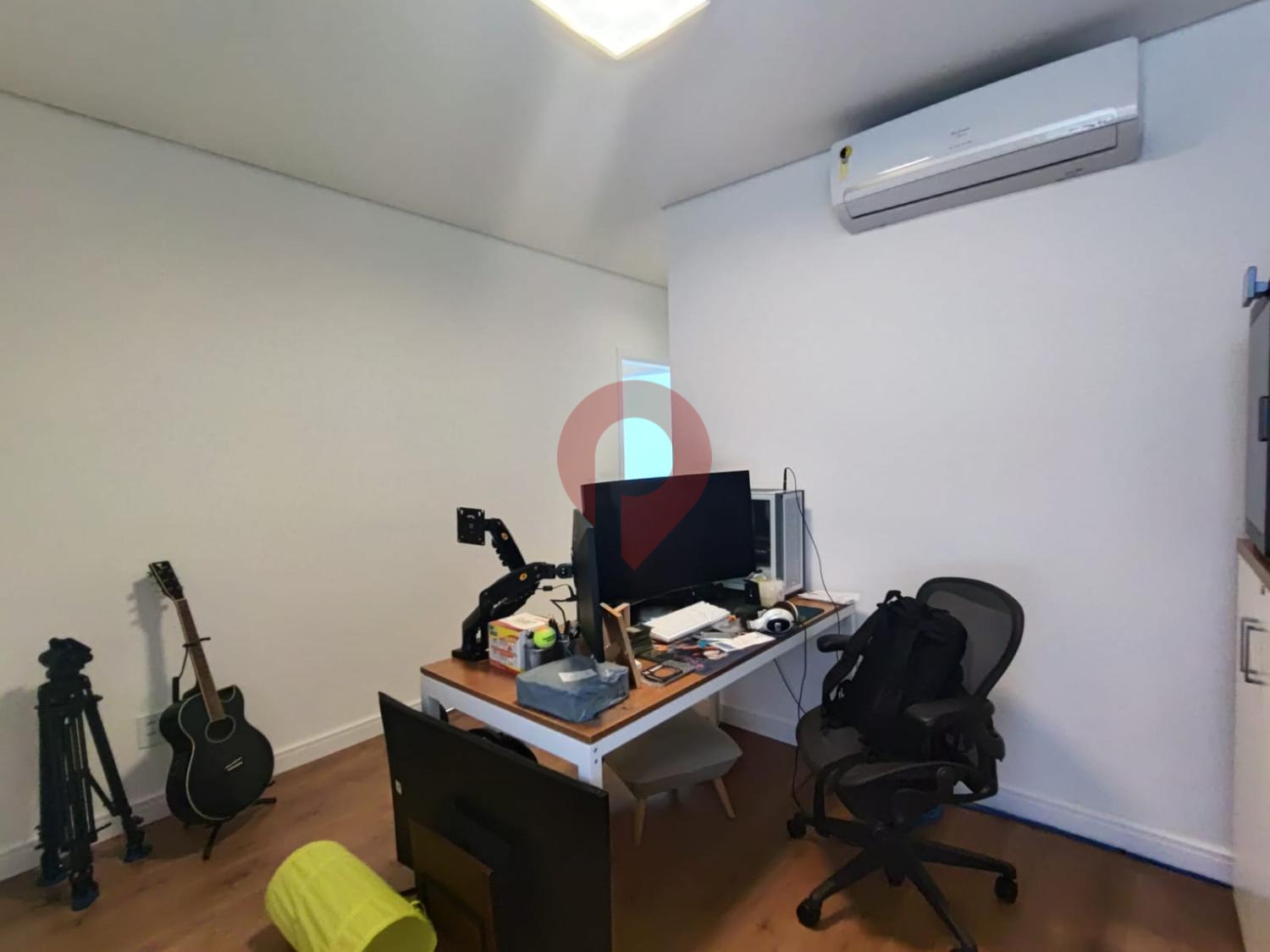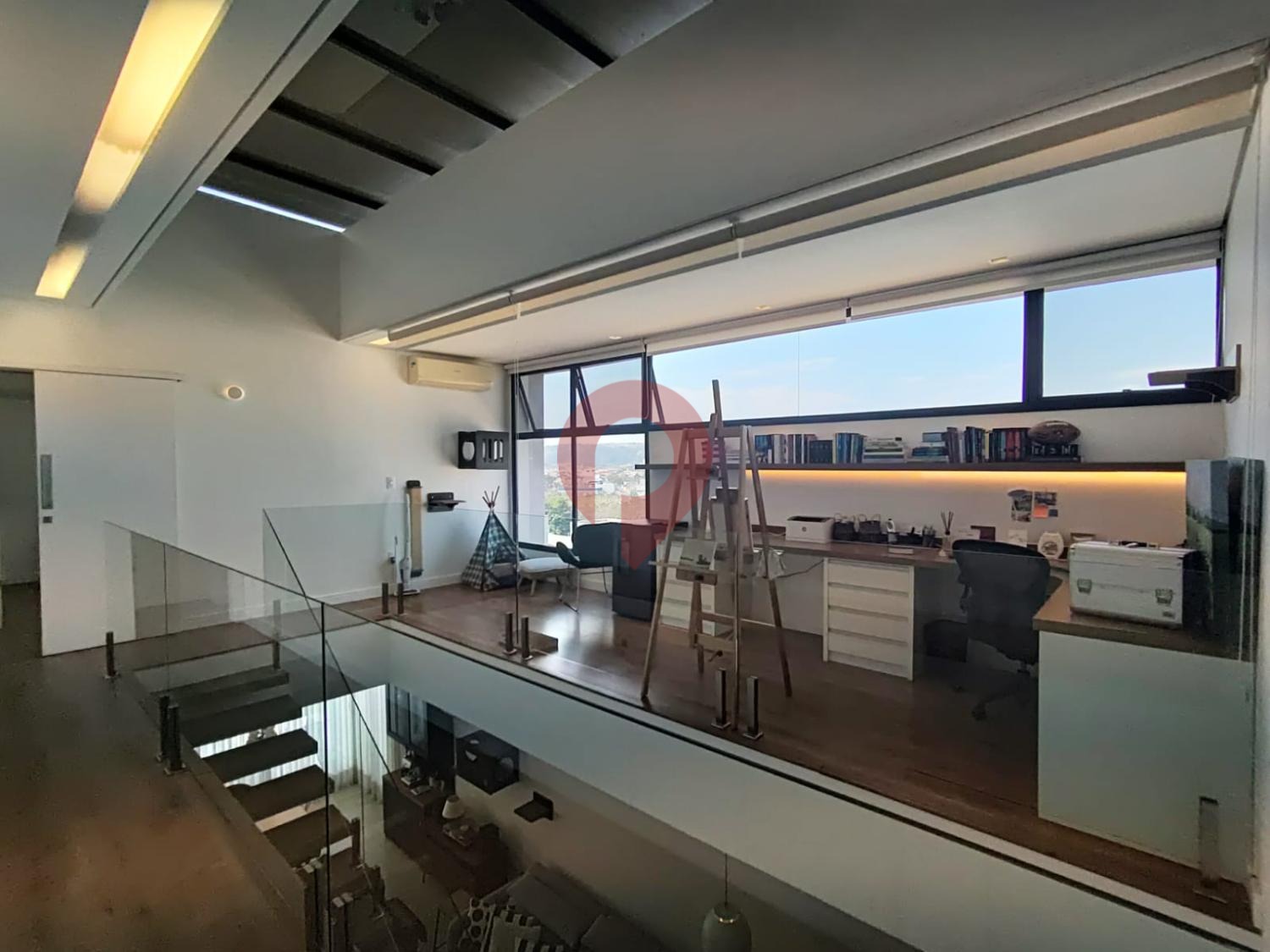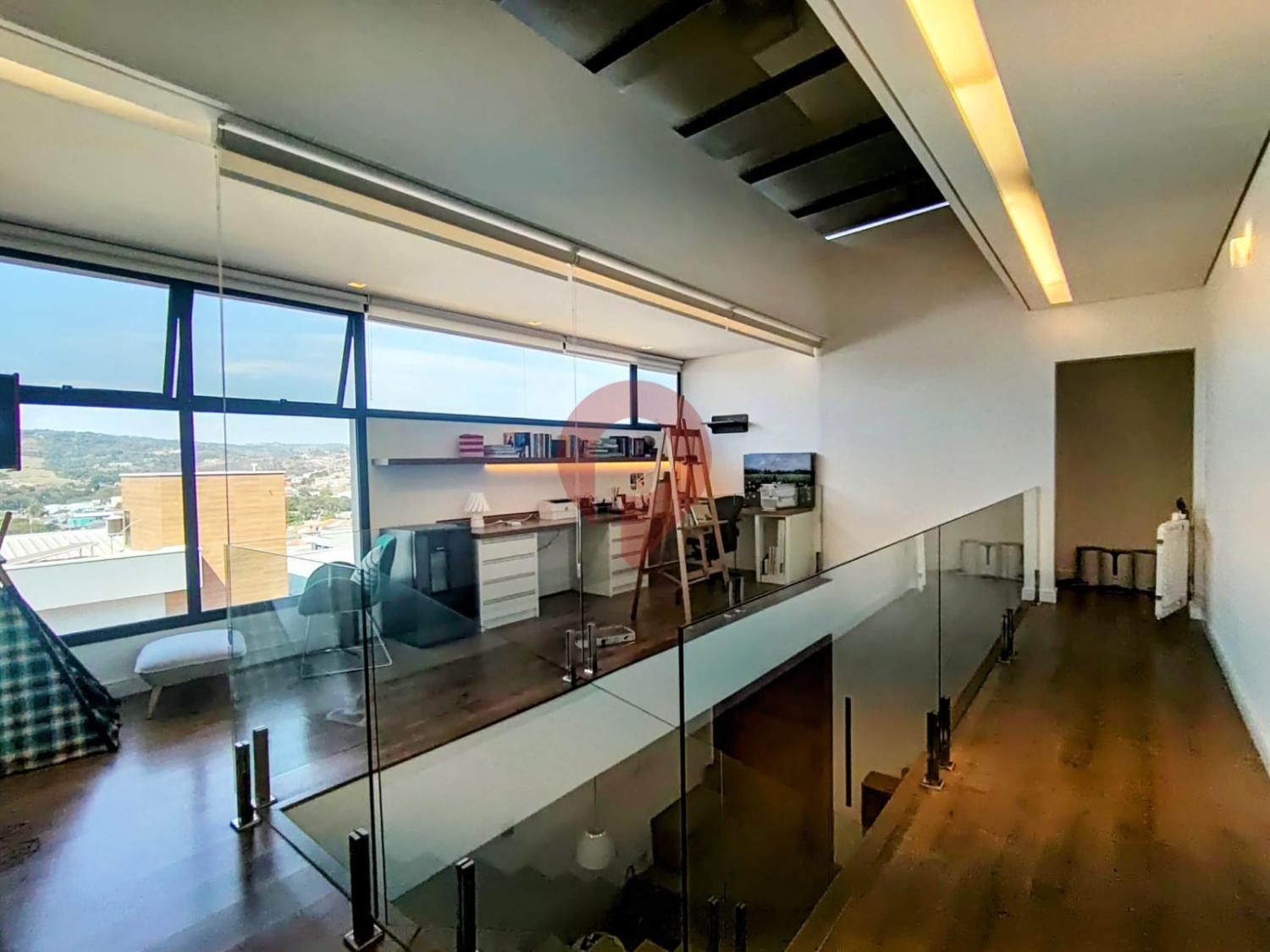 O mezanino conta com um escritório finamente mobiliado, ideal tanto para o trabalho quanto para momentos de relaxamento, com uma janela ampla que proporciona uma visão privilegiada da área externa, sem contar o teto retrátil.