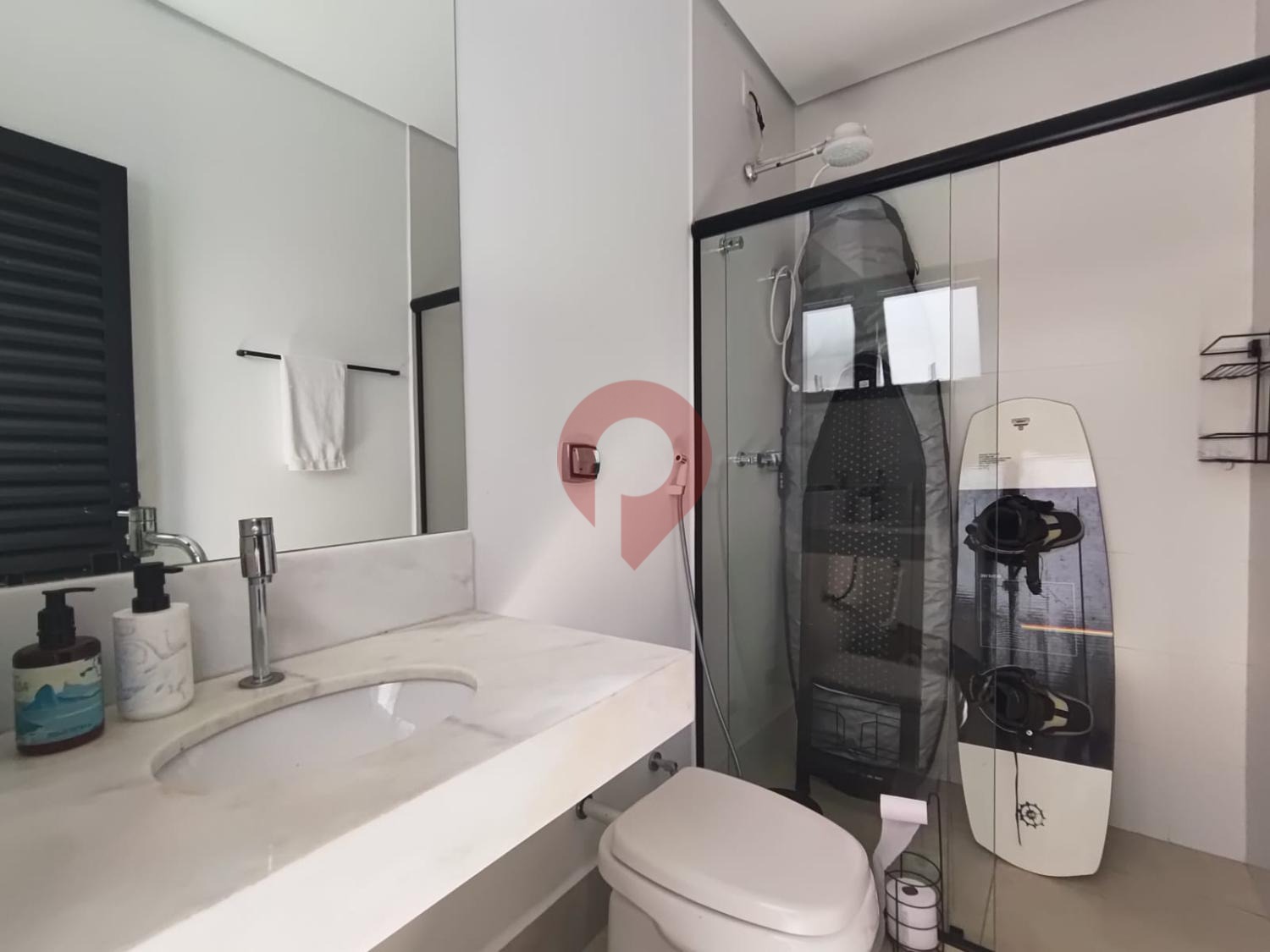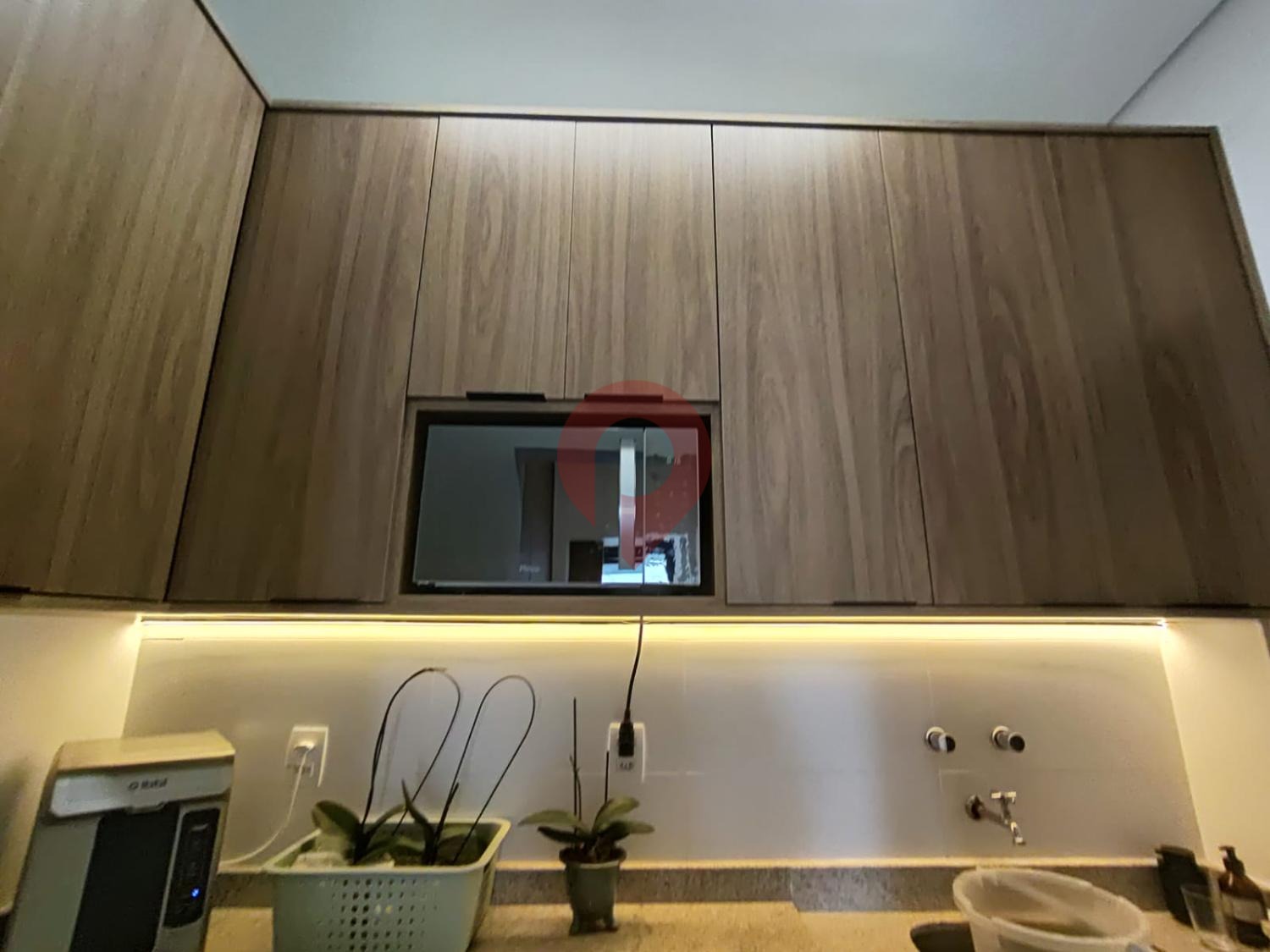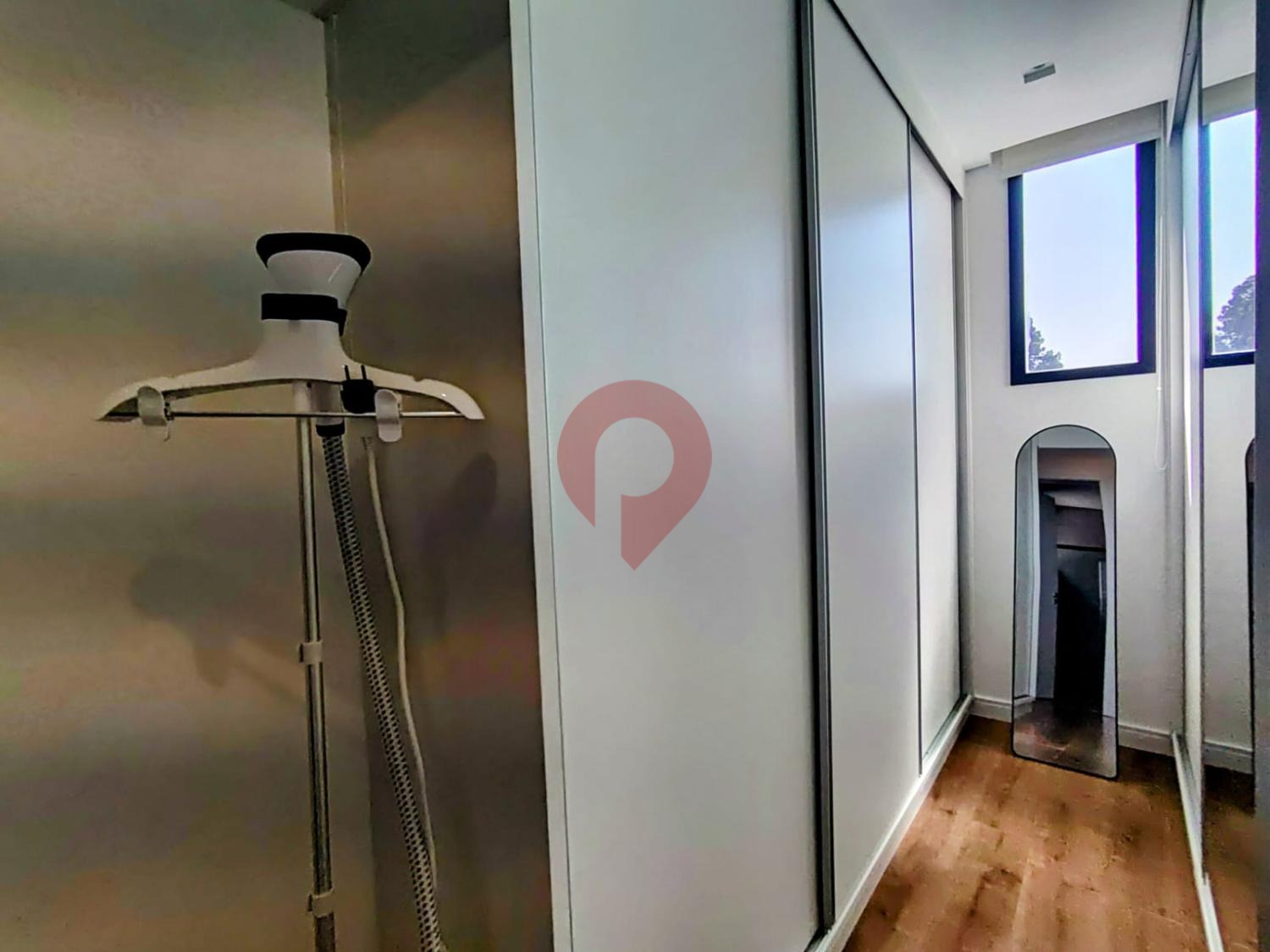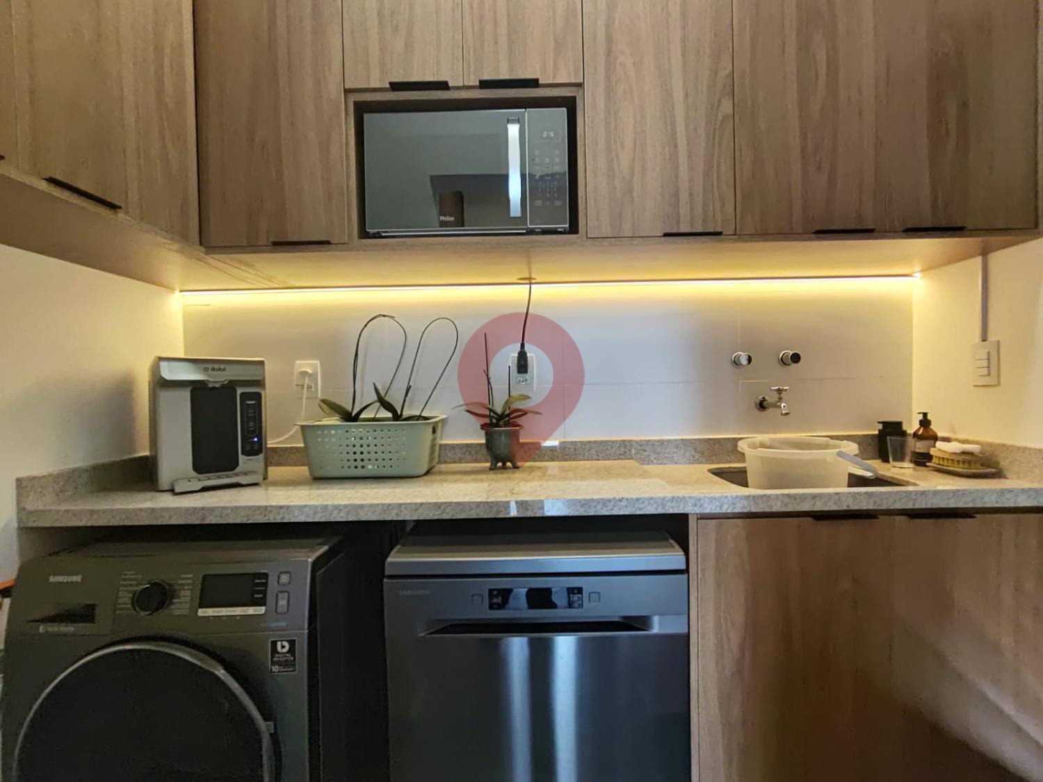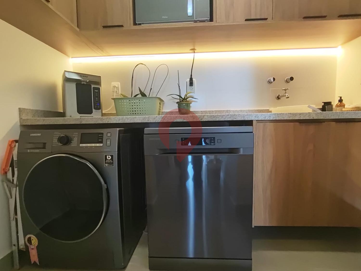 A lavanderia, também completa e repleta de armários sob medida, complementa o ambiente com discrição e eficiência.