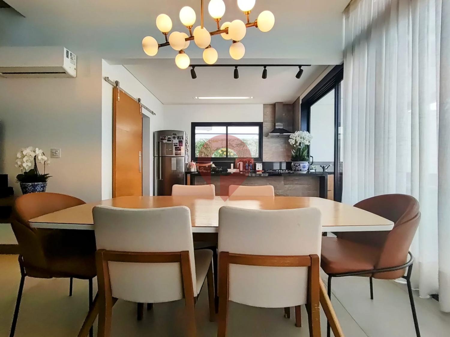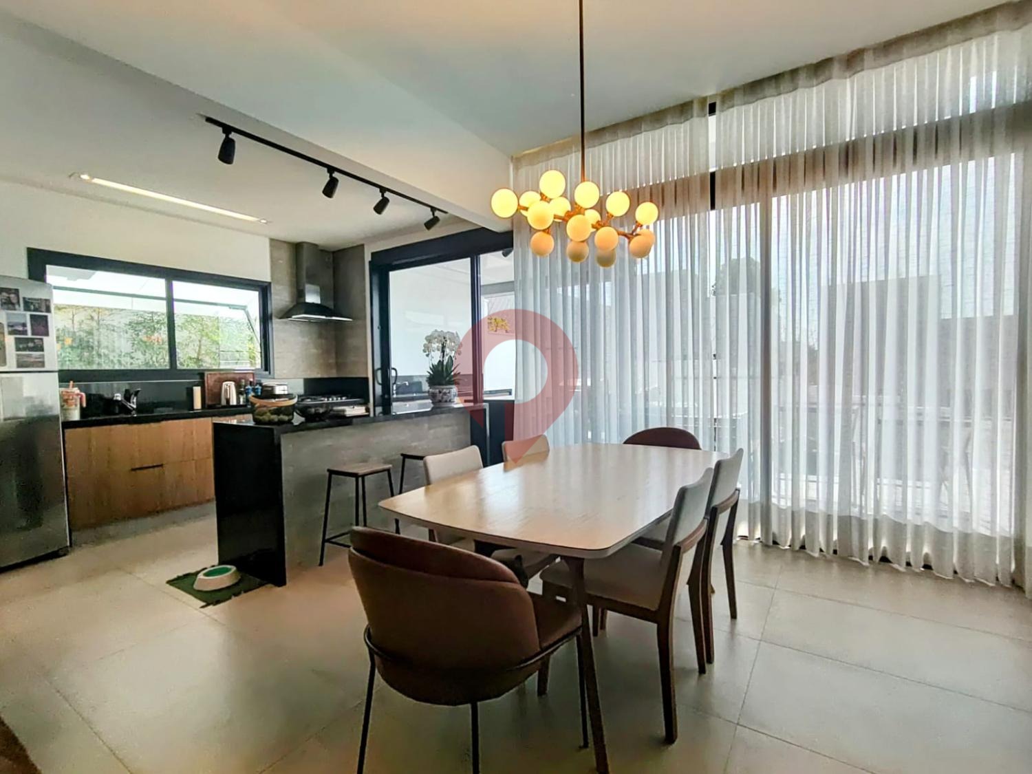 A sala de jantar, com design clean, se integra à cozinha no estilo americano, equipada com móveis planejados de alto padrão, oferecendo praticidade e beleza no dia a dia.