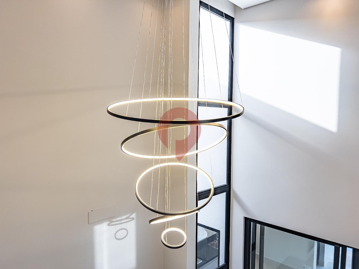 Logo na entrada, a imponente porta pivotante de 5 metros, equipada com fechadura eletrônica, antecipa o padrão elevado que se estende por toda a casa. Ao entrar, um amplo espaço integrado revela a sala de estar com pé-direito duplo, conectada harmoniosamente à sala de jantar, sala de TV e à cozinha planejada — um conjunto moderno e fluido, ideal para receber e viver momentos inesquecíveis.