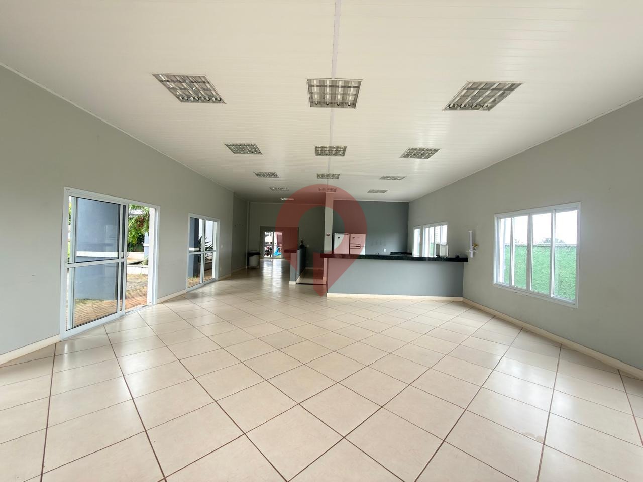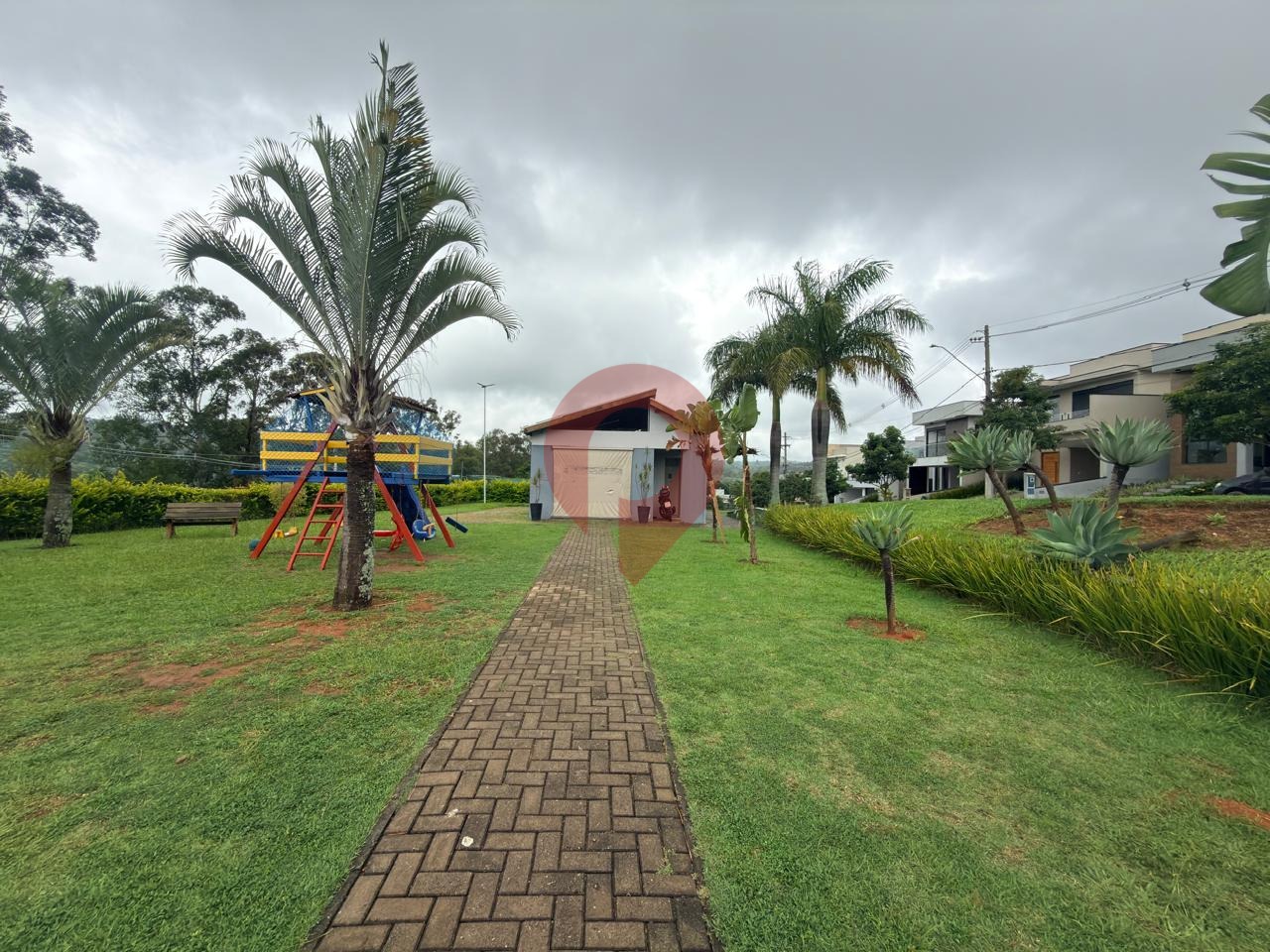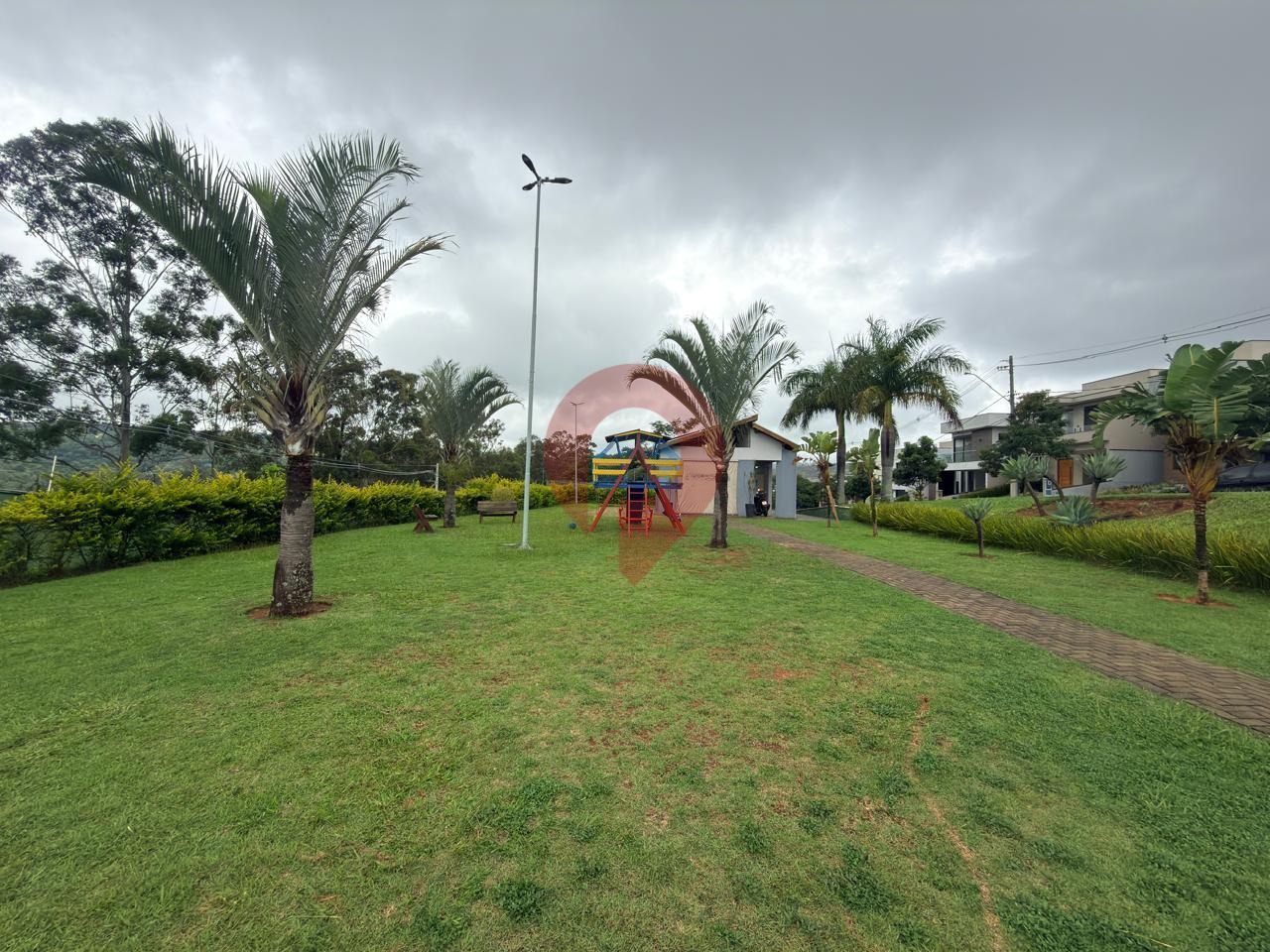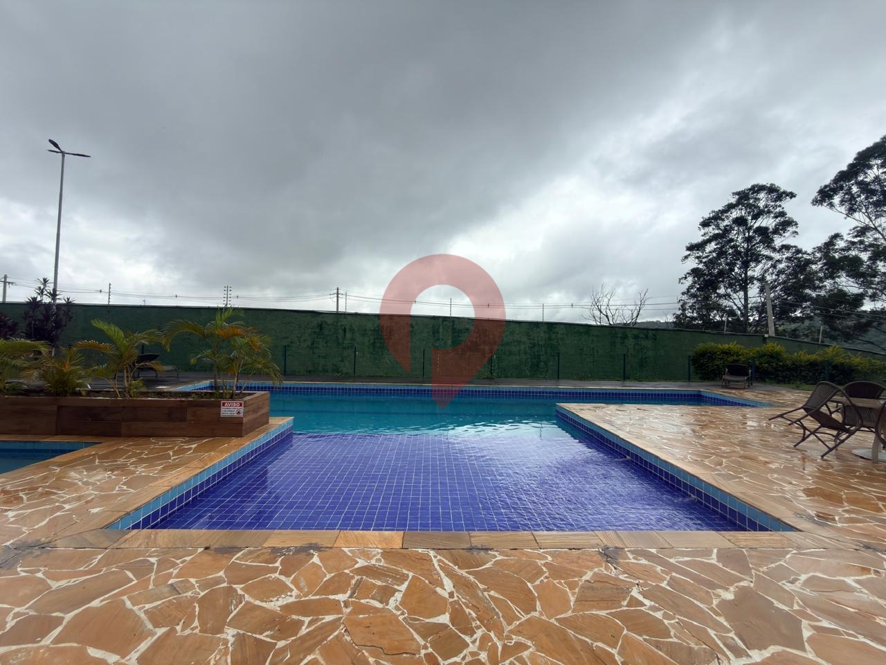 Condomínio com área de lazer sendo piscina, salão de festas, playground e campo de futebol.