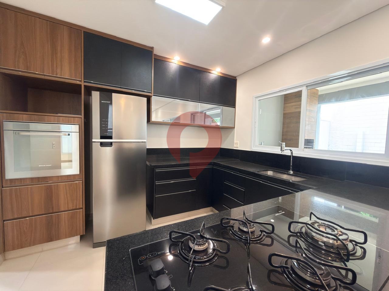 Cozinha ricamente planejada, com geladeira, torre quente com forno e máquina de lavar louça.
