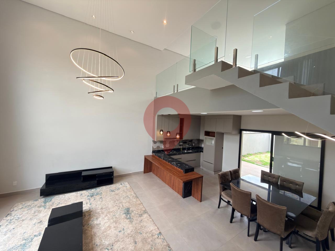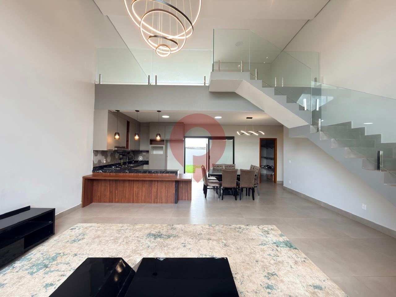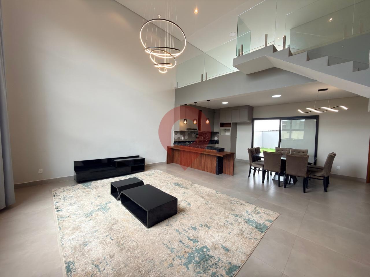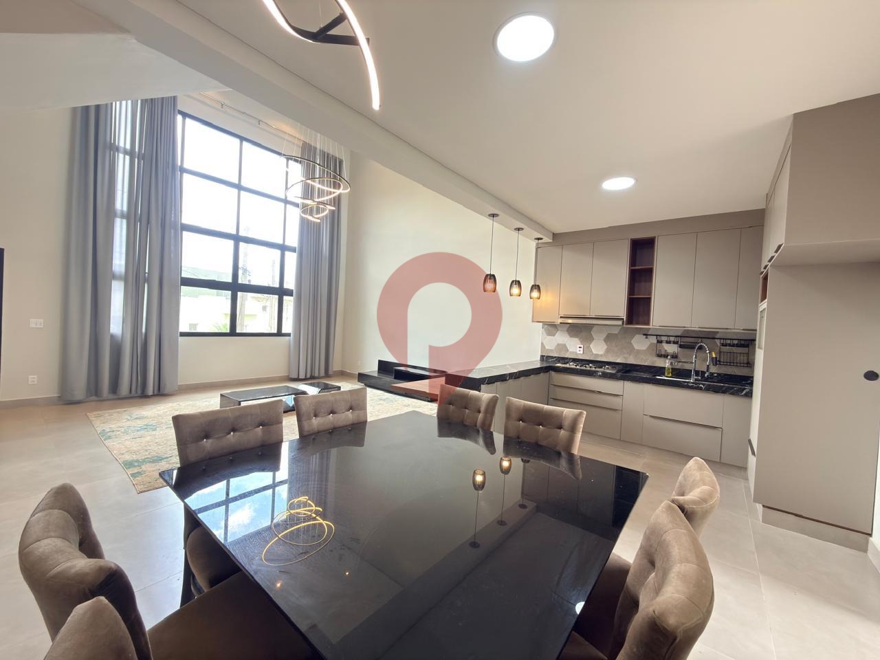 Logo ao entrar, você é recebido por uma ampla sala de estar e jantar integradas à cozinha, criando um ambiente moderno e acolhedor, valorizado pelo imponente pé-direito duplo que garante excelente iluminação natural e sensação de espaço.