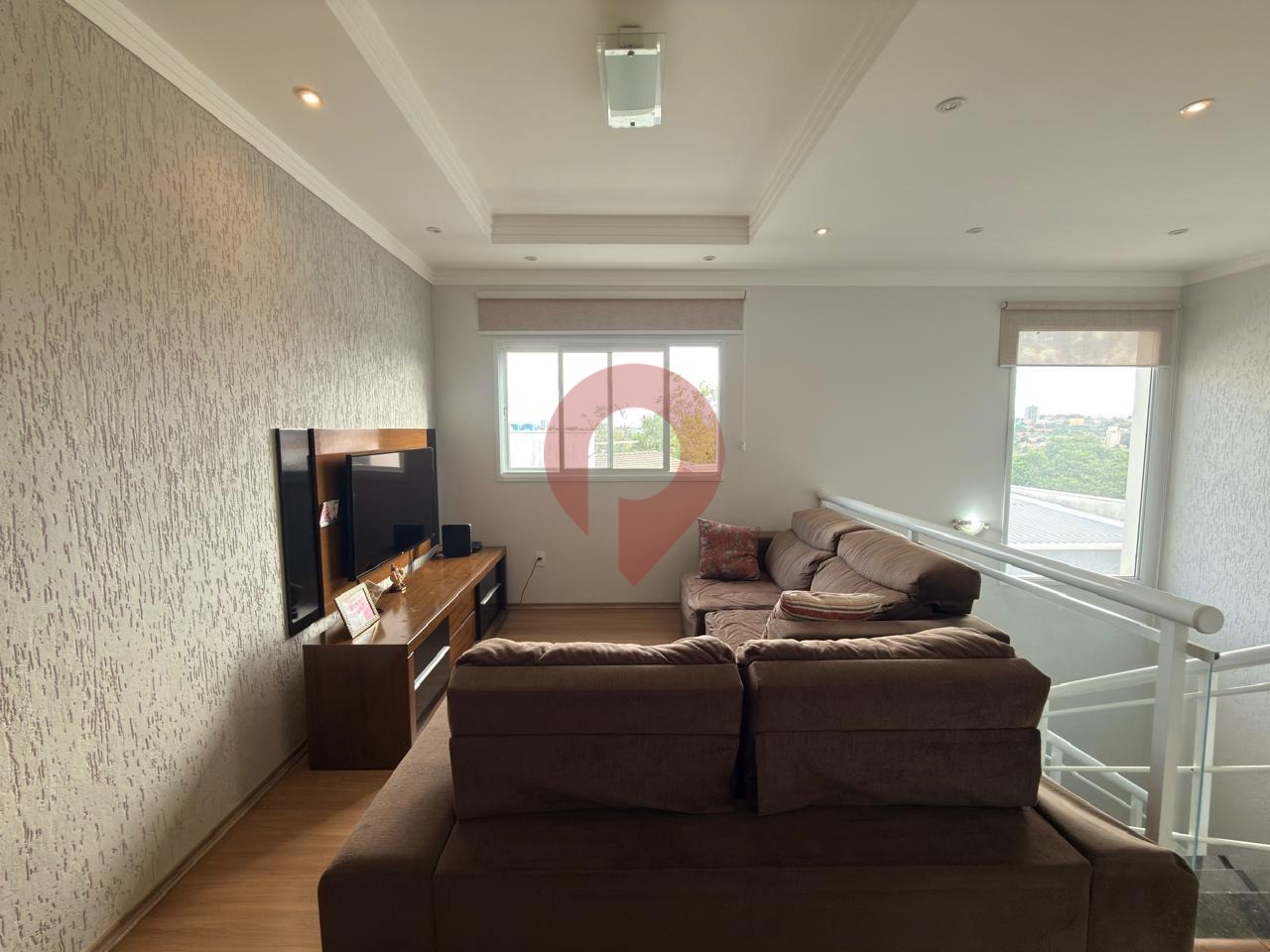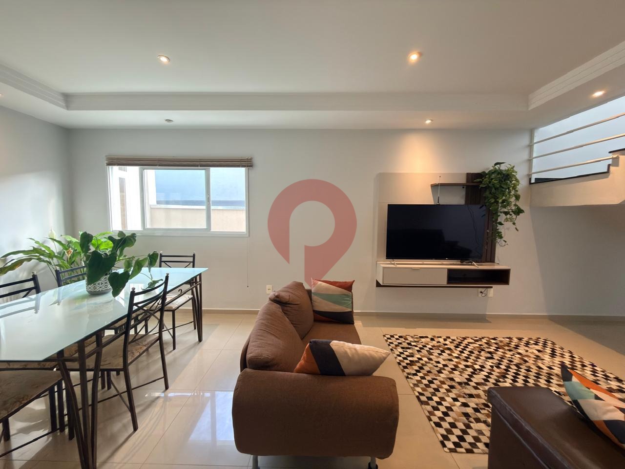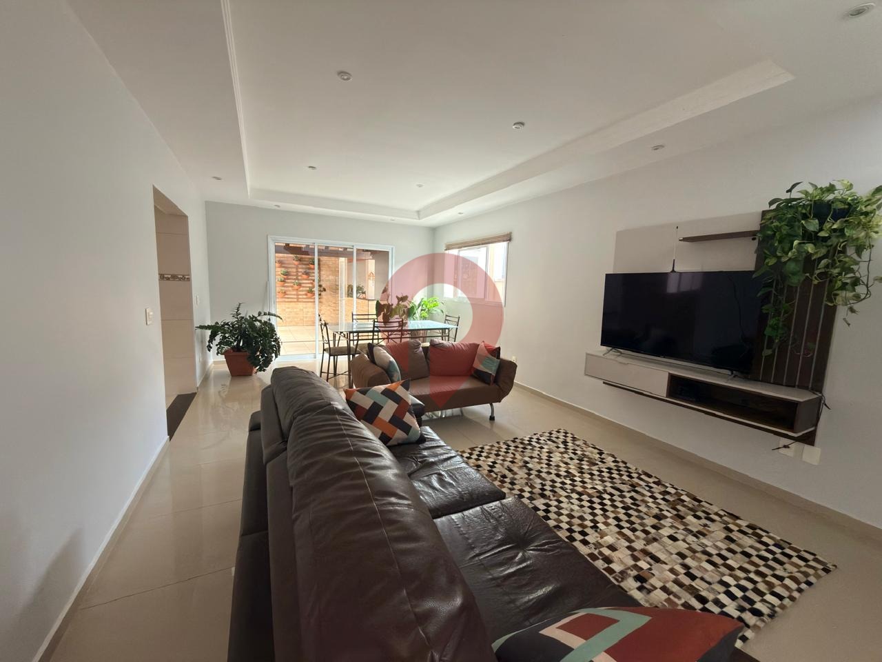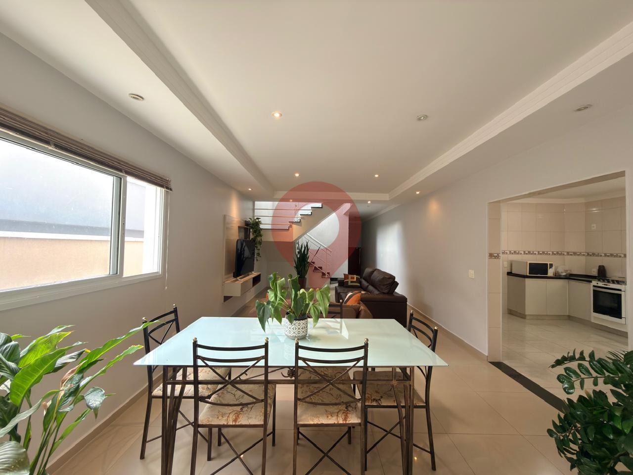 As áreas sociais são bem distribuídas, com sala de TV, sala de estar e sala de jantar, criando ambientes integrados e acolhedores.