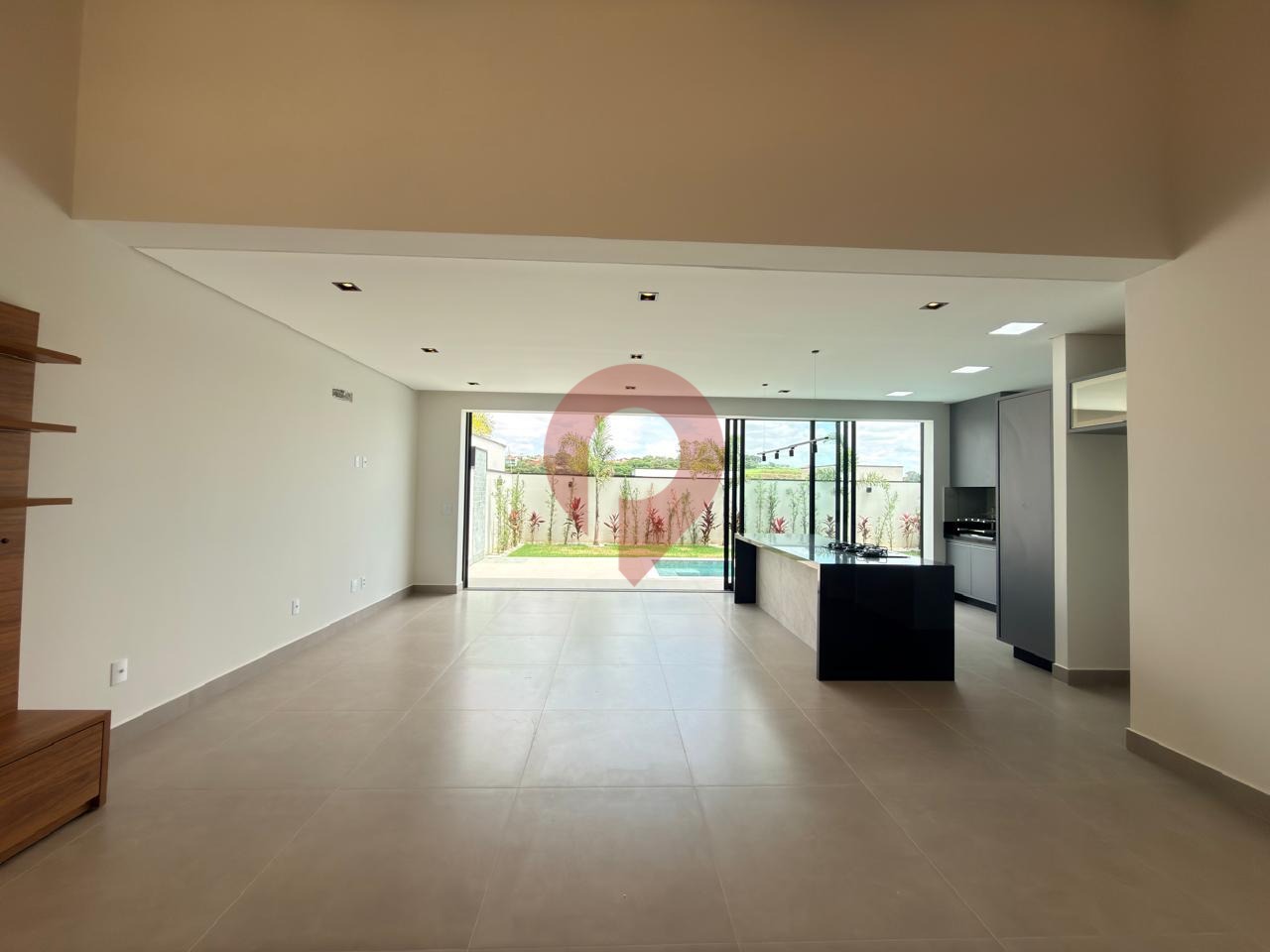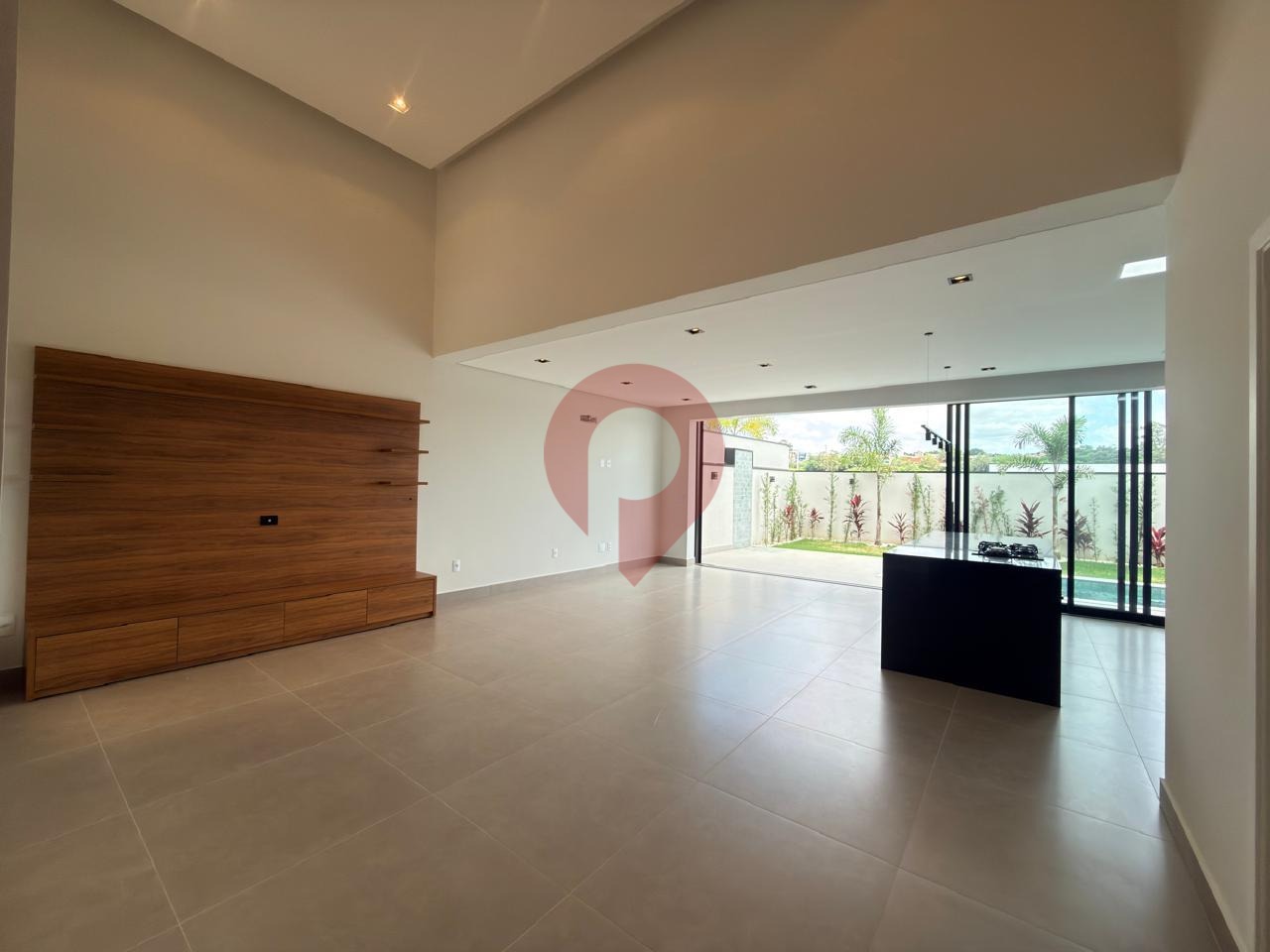 O living conta com dois ambientes integrados, com espaços harmoniosos para sala de TV e sala de jantar, conectados de forma fluida à agradável área da piscina, criando o cenário perfeito para momentos de lazer e convivência.