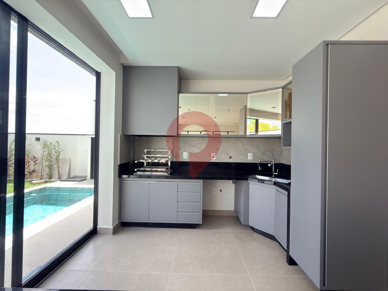A casa ainda conta com escritório, perfeito para home office, além de lavabo para maior comodidade das visitas. Pensando na funcionalidade, dispõe também de lavanderia independente e banheiro externo, atendendo perfeitamente à área de lazer.