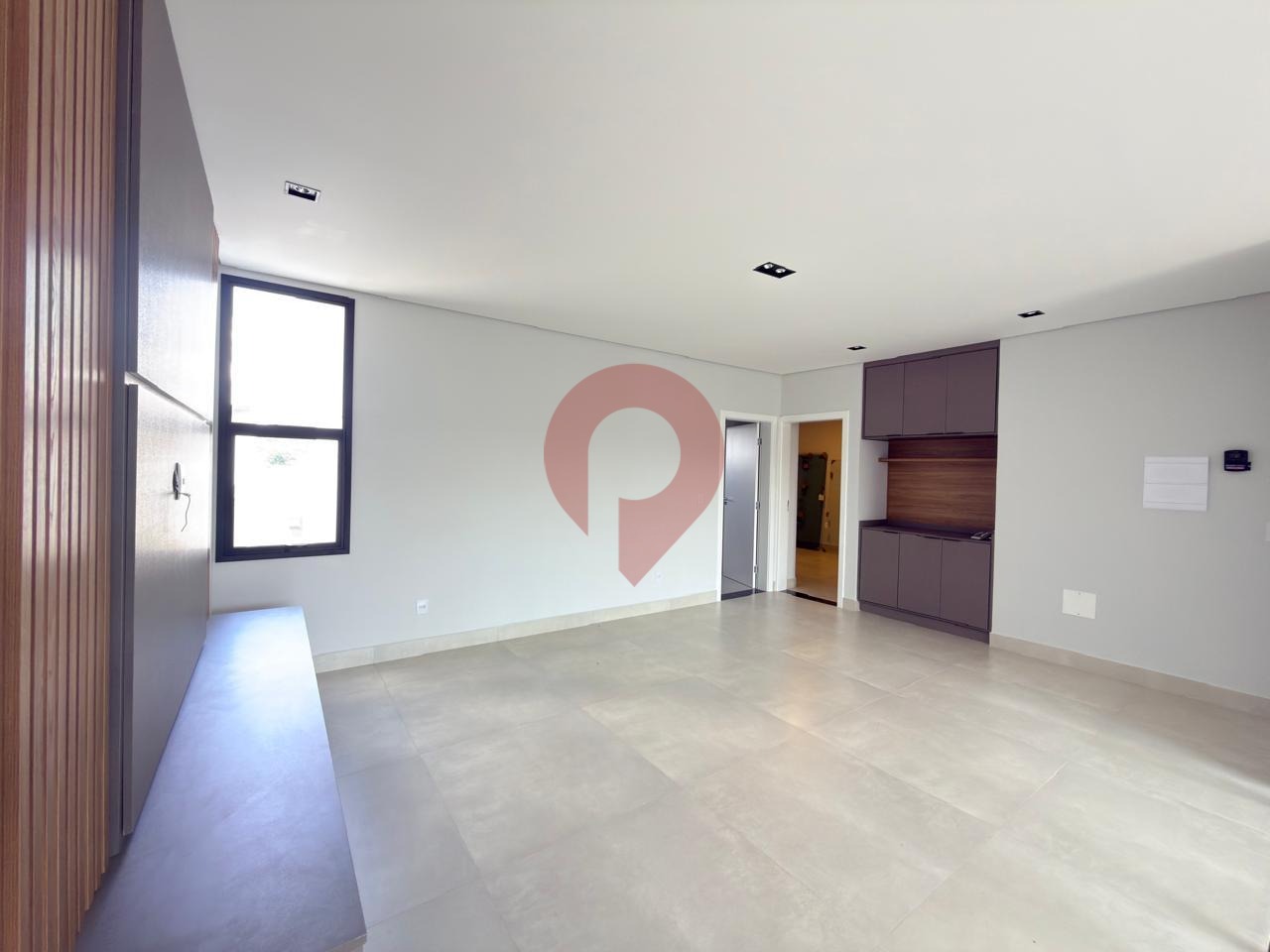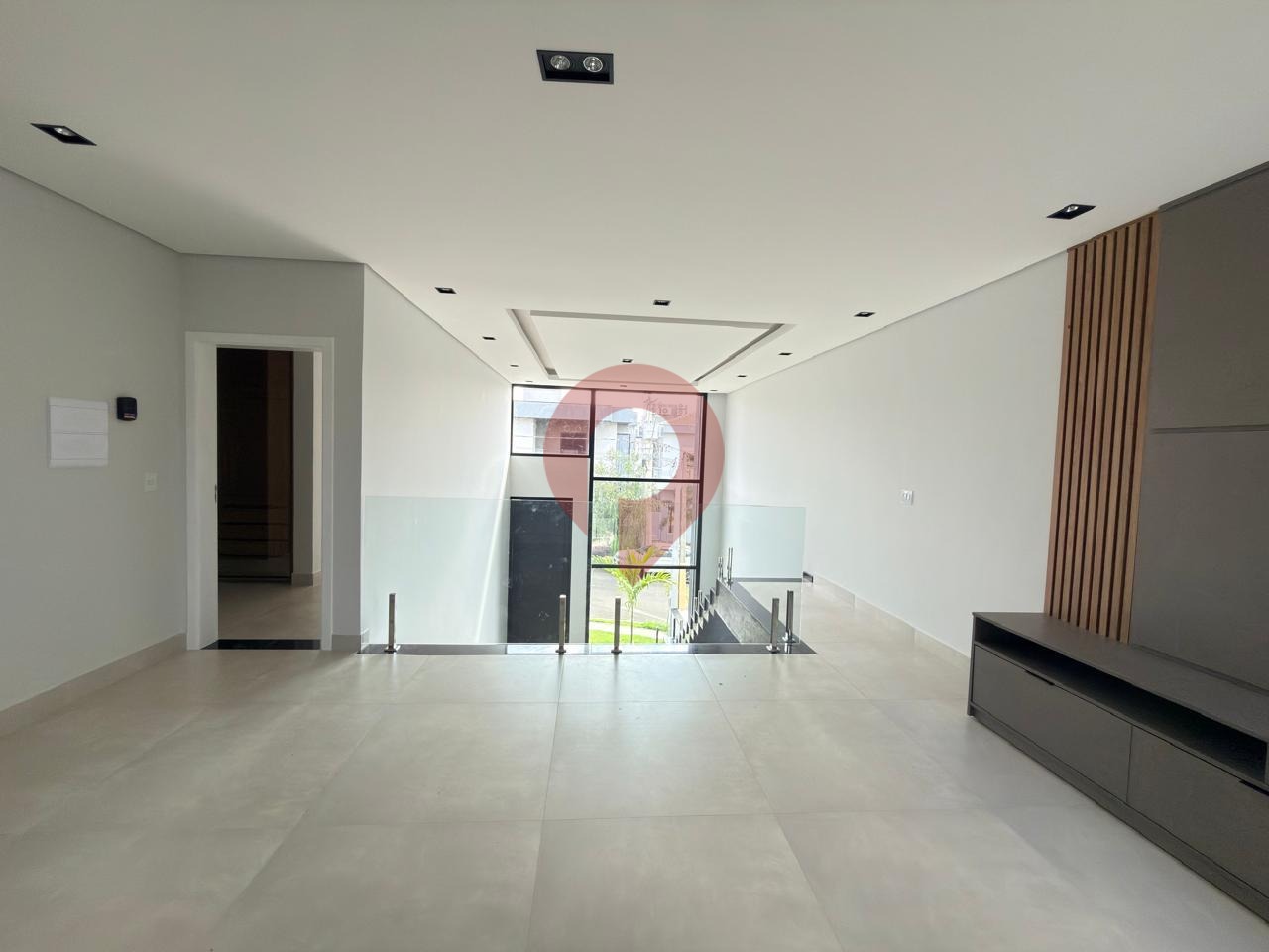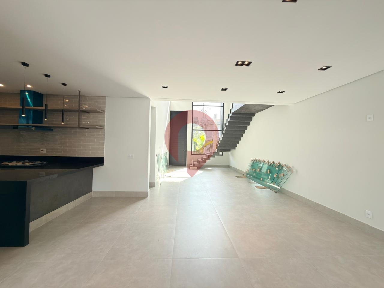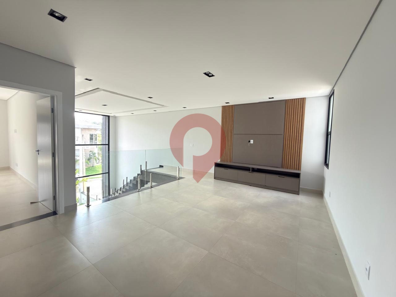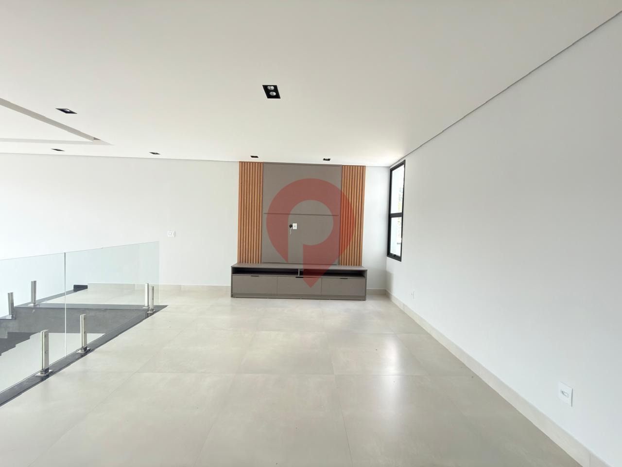 No pavimento inferior, o amplo living para dois ambientes se destaca pelo pé-direito duplo, proporcionando luminosidade natural abundante e uma agradável sensação de amplitude.