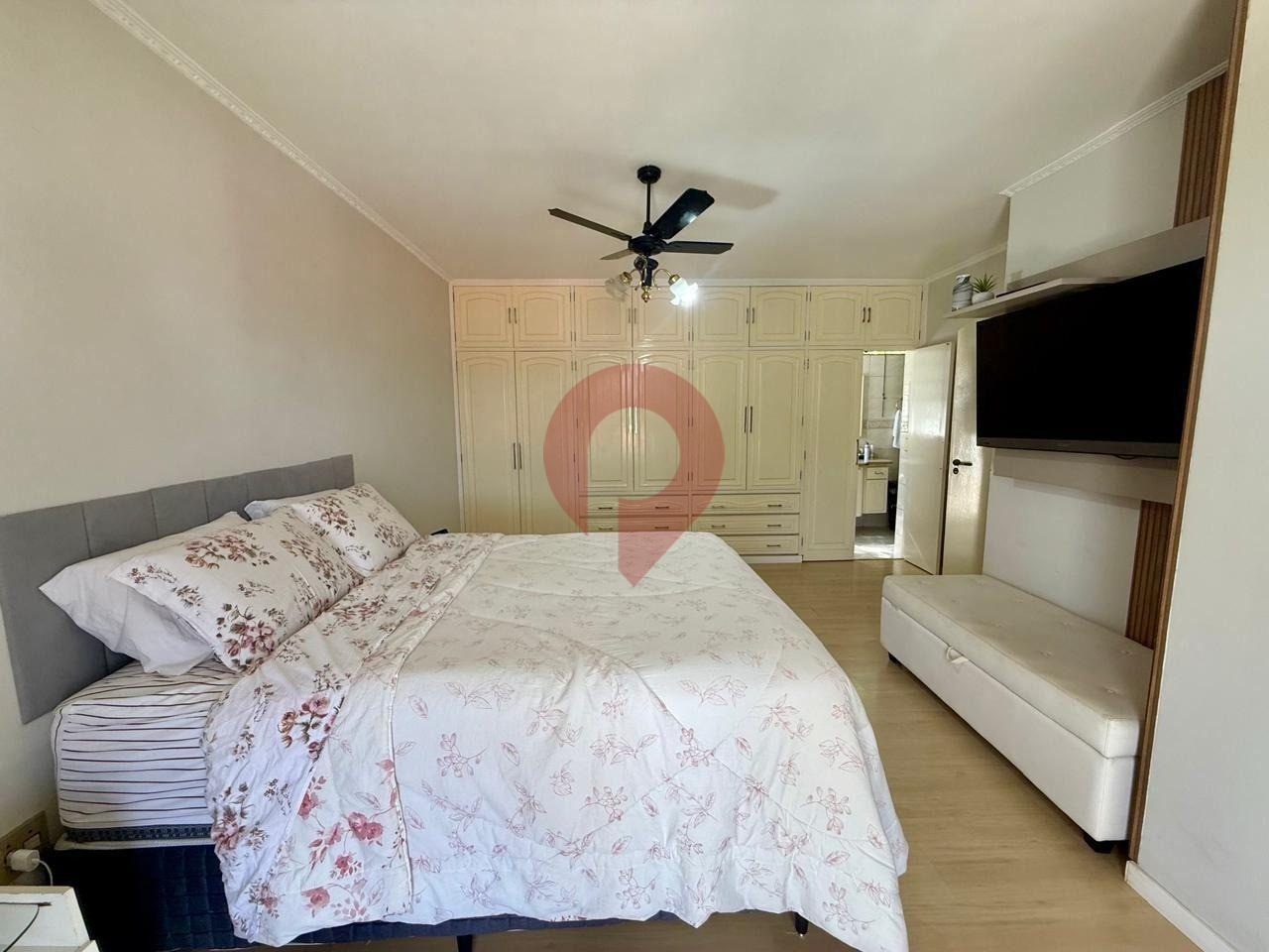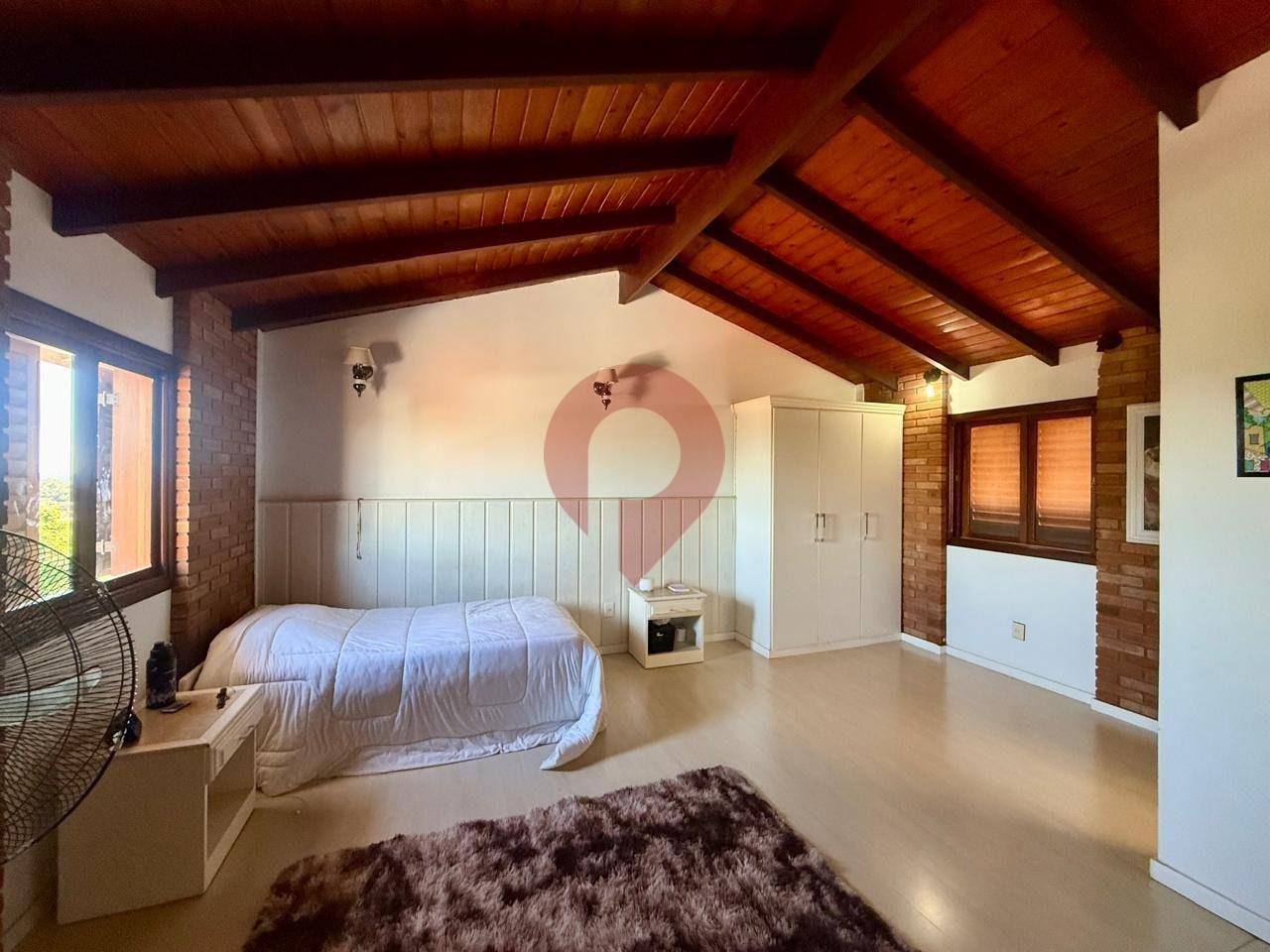 No pavimento superior, encontra-se uma ampla suíte com uma vista deslumbrante, perfeita para relaxar e apreciar o entorno.